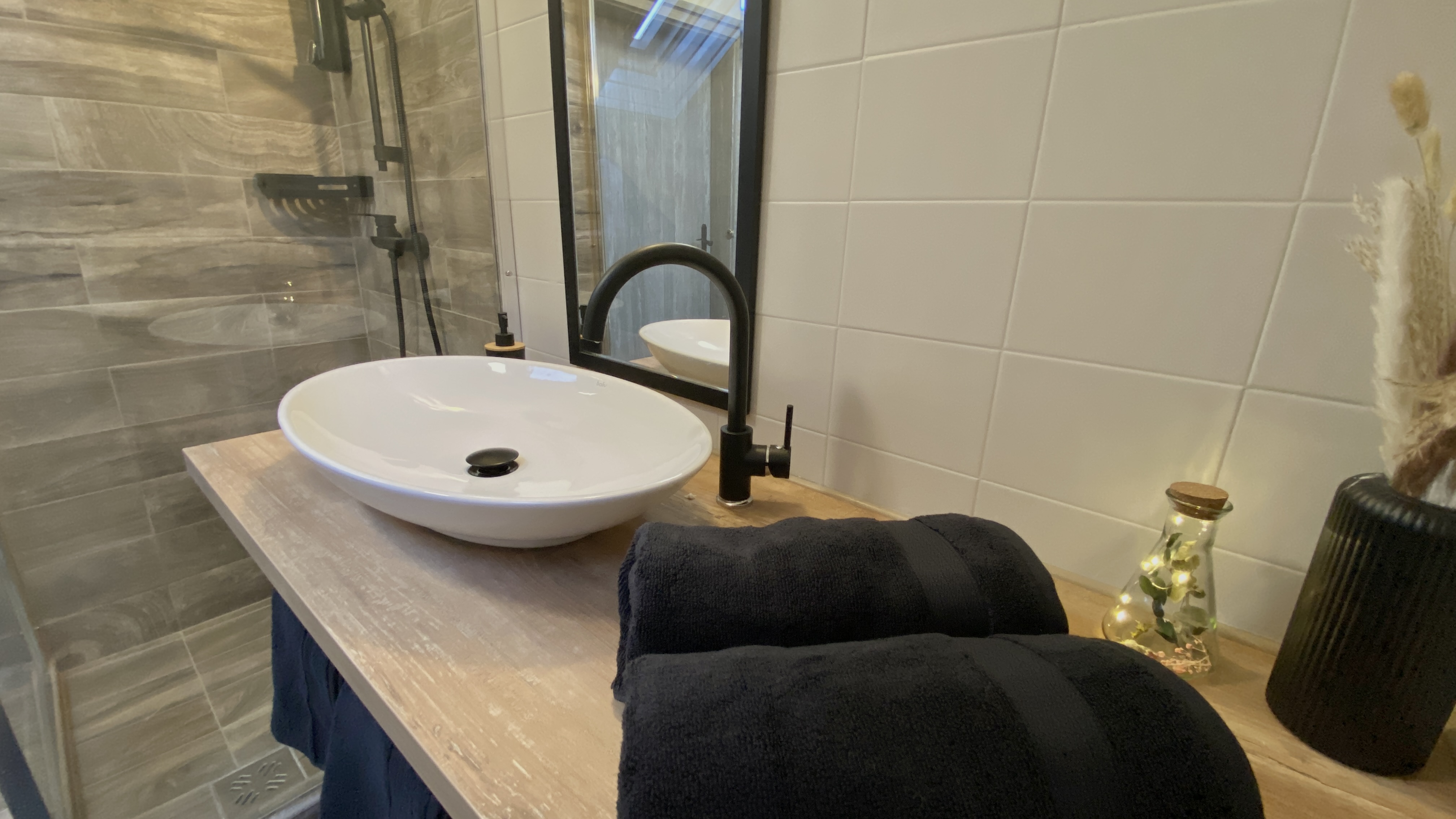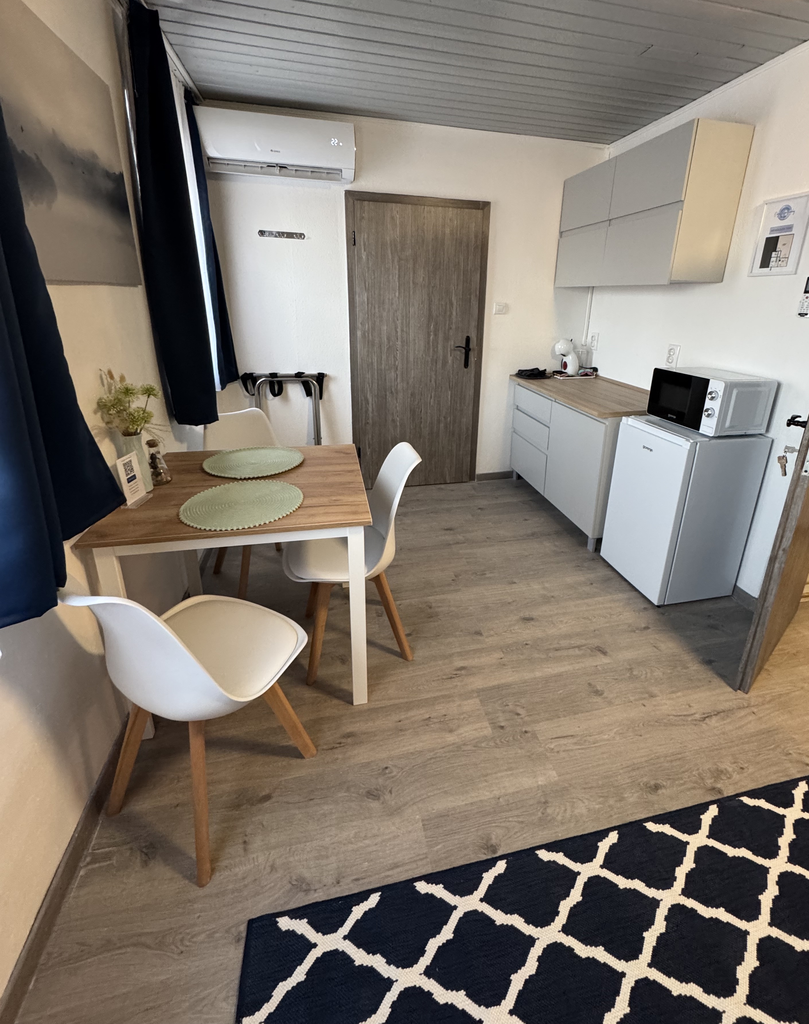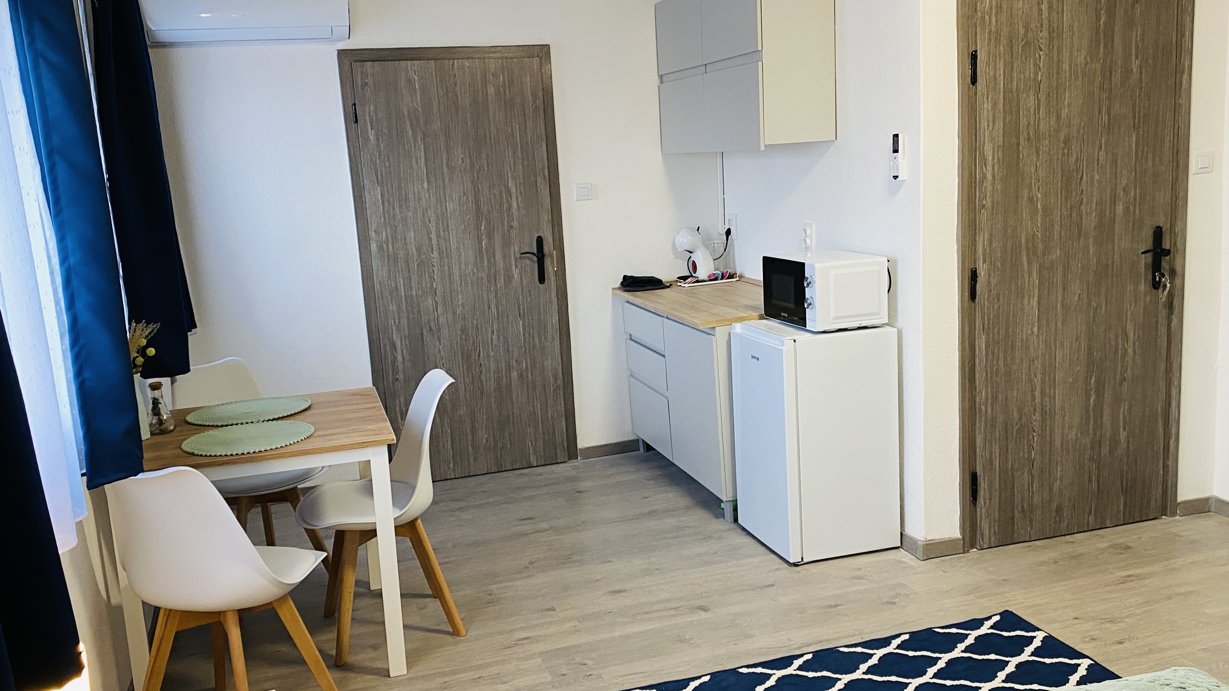 A hangulatos zuhanyzós fürdőszoba és a felszerelt konyha – kávéfőző, teaforraló, mikró és hűtő – garantálja a kényelmet és a praktikusságot.